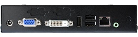 Linutop placed on the back of a flat panel, with the monitor mounting bracket accessory.